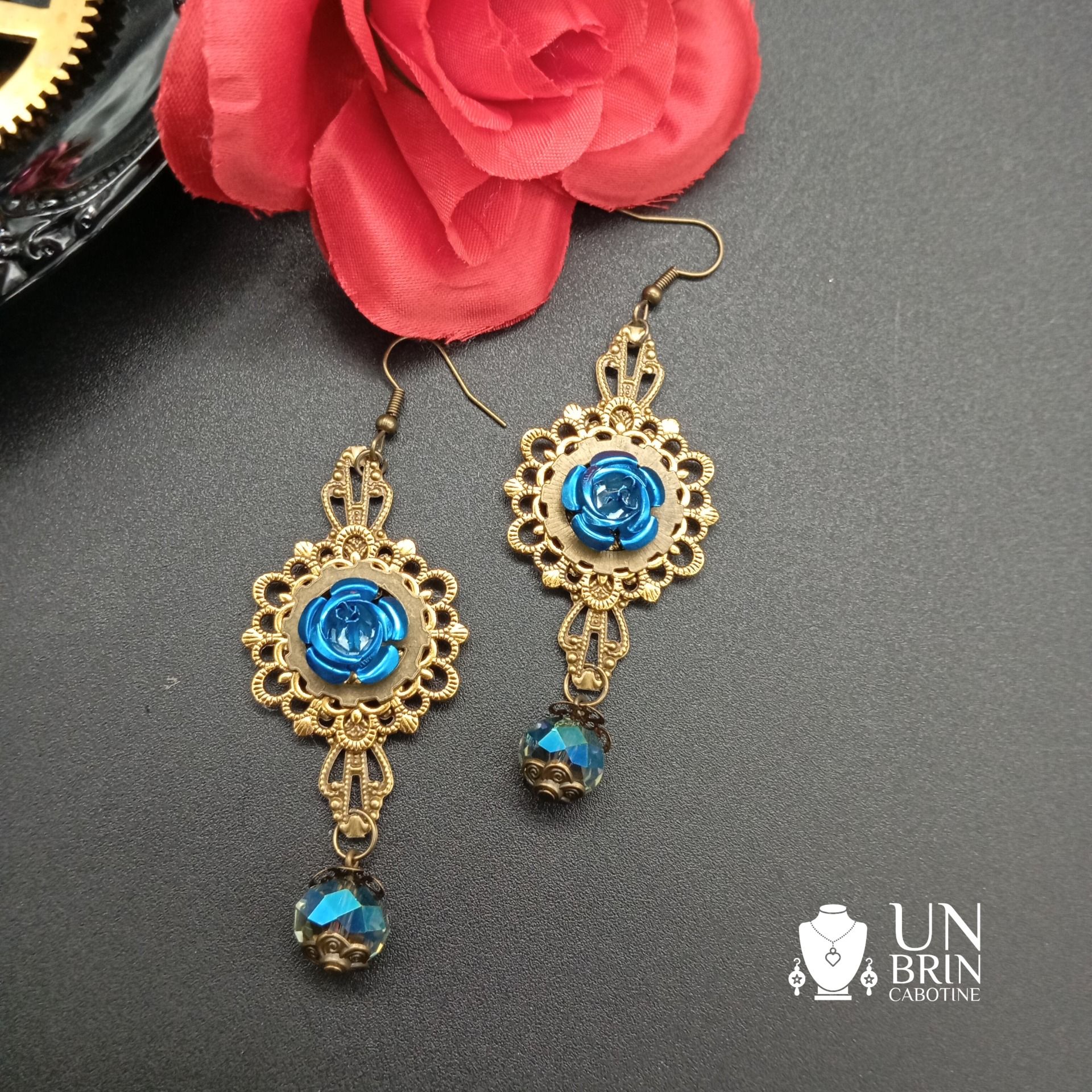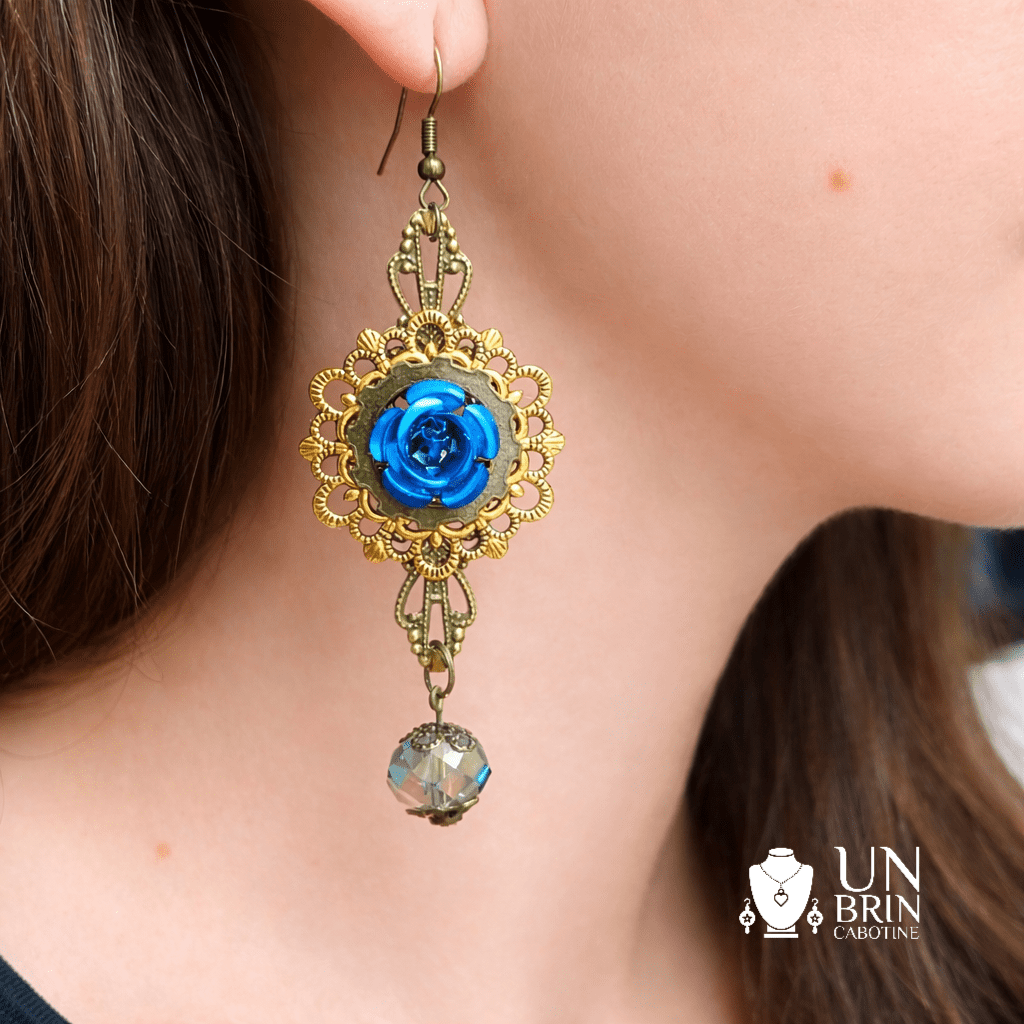 Affirmez votre élégance avec ces boucles d'oreilles d'exception, conçues comme un trésor d'époque. Ce modèle spectaculaire marie la finesse d'un blason doré aux accents victoriens avec l'éclat hypnotique d'une rose bleu saphir.