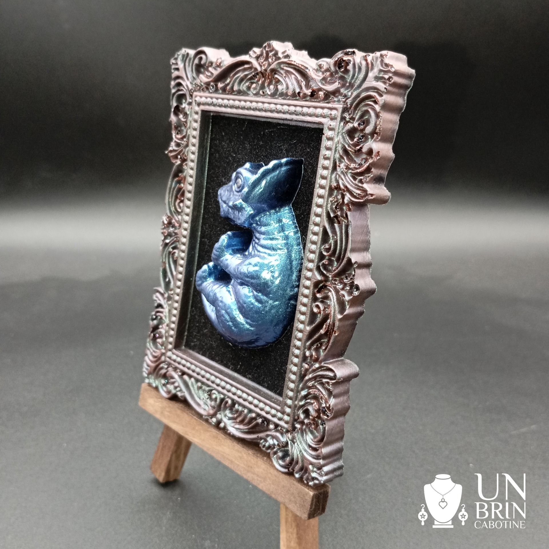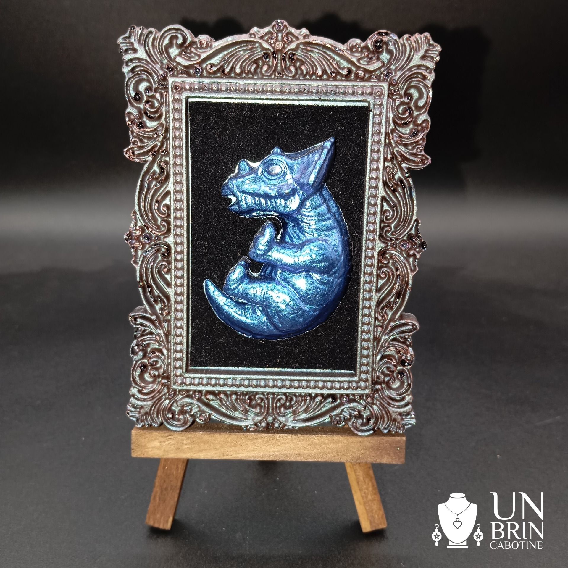 - Matériaux : Le cadre et le bébé dinosaure bleu, sont en résine époxy. Mini chevalet en bois.