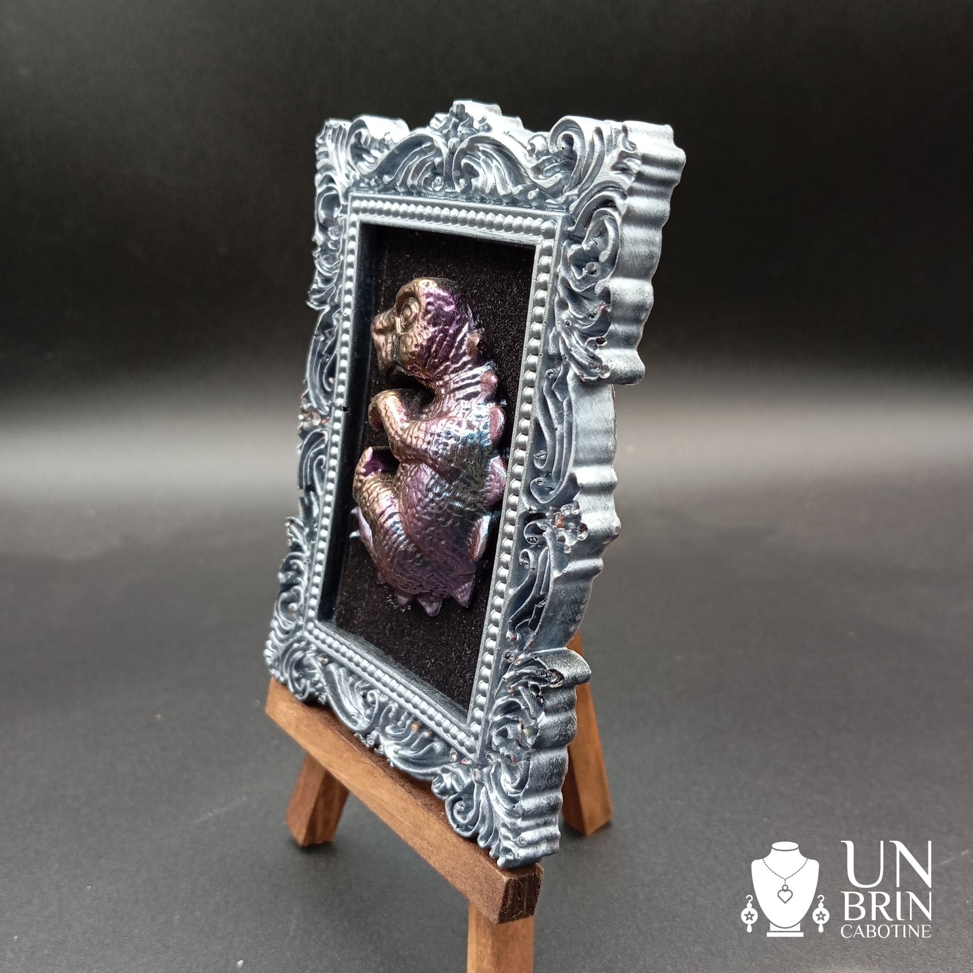 - Matériaux : Le cadre et le bébé dinosaure rose et gris/bleu, sont en résine époxy. Mini chevalet en bois.