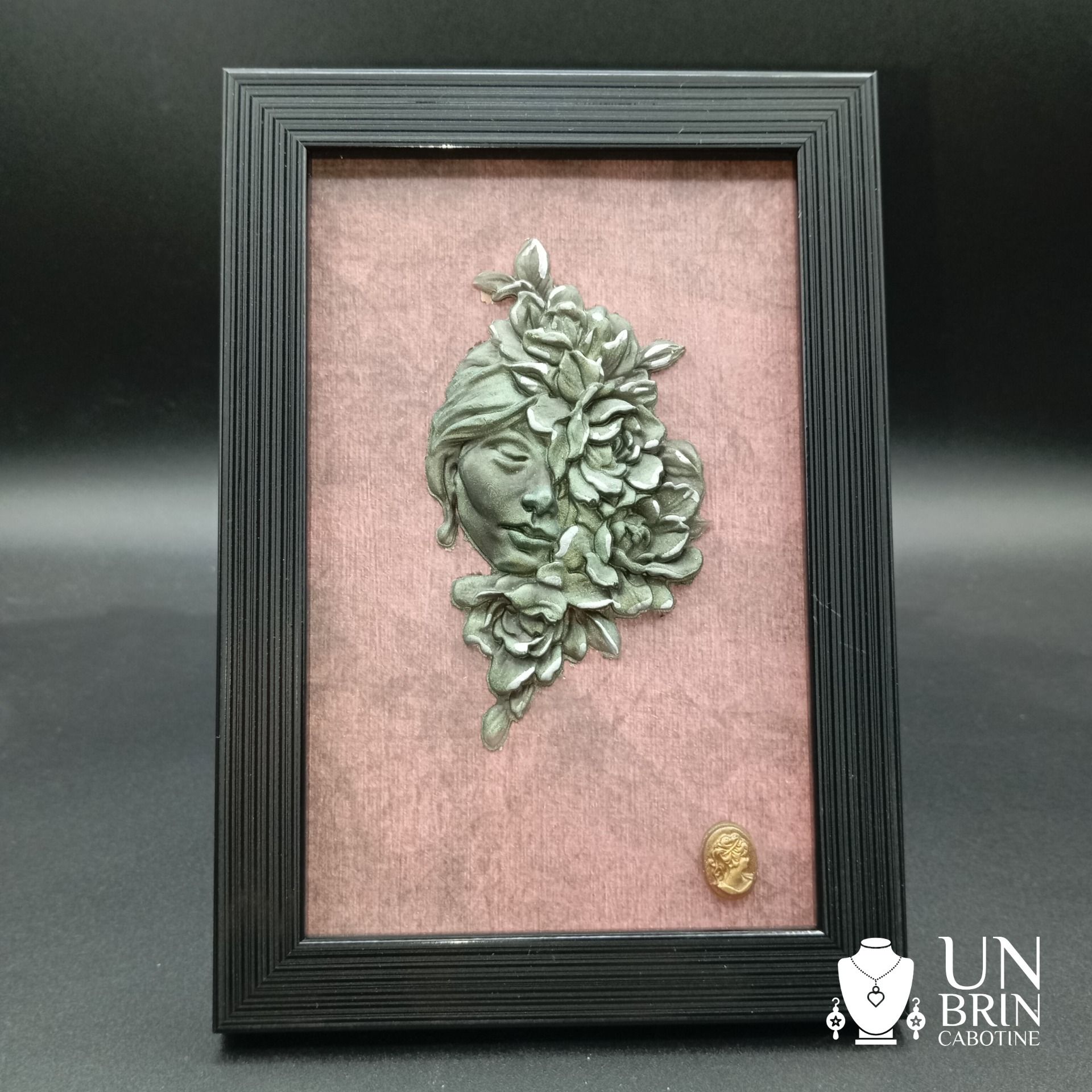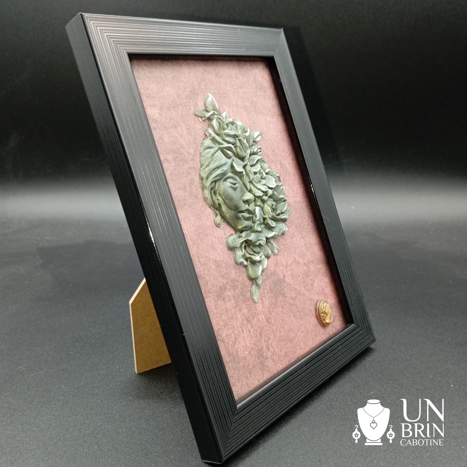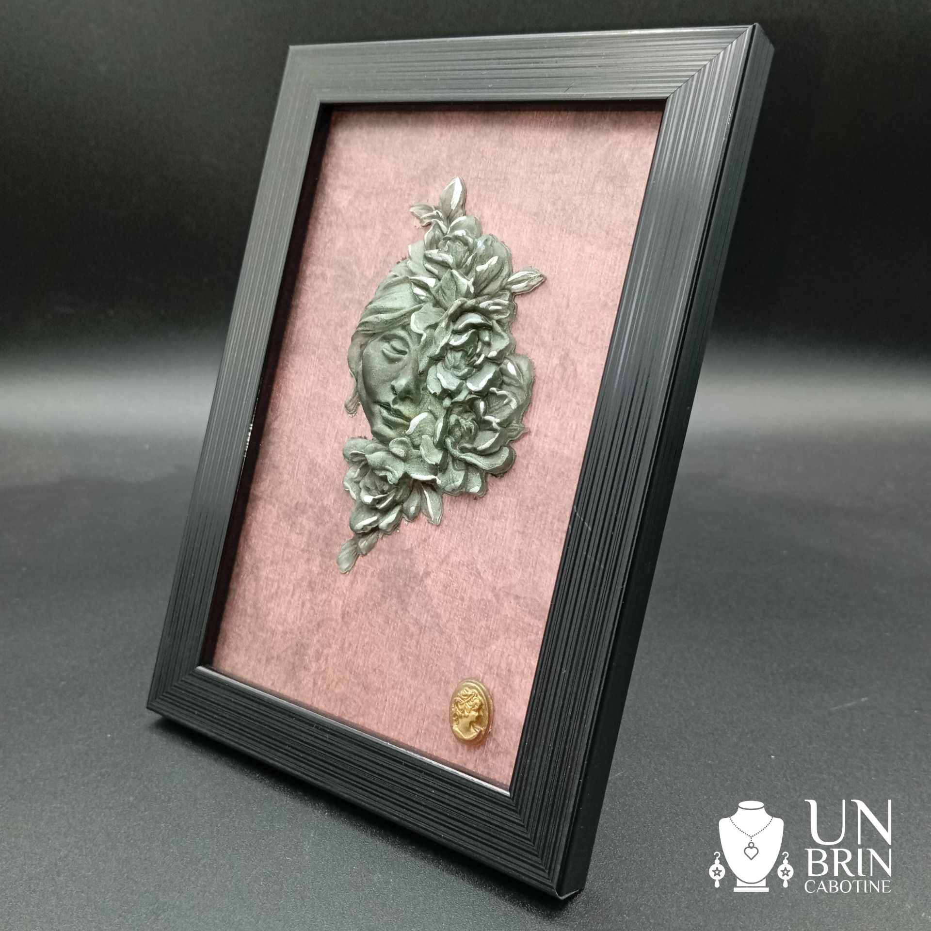- Matériaux : Visage feminin, fleuri dans les tons verts. Et son camée, en bas à droite, en résine époxy. Fond du cadre dans les tons rouge/ bordeaux.
