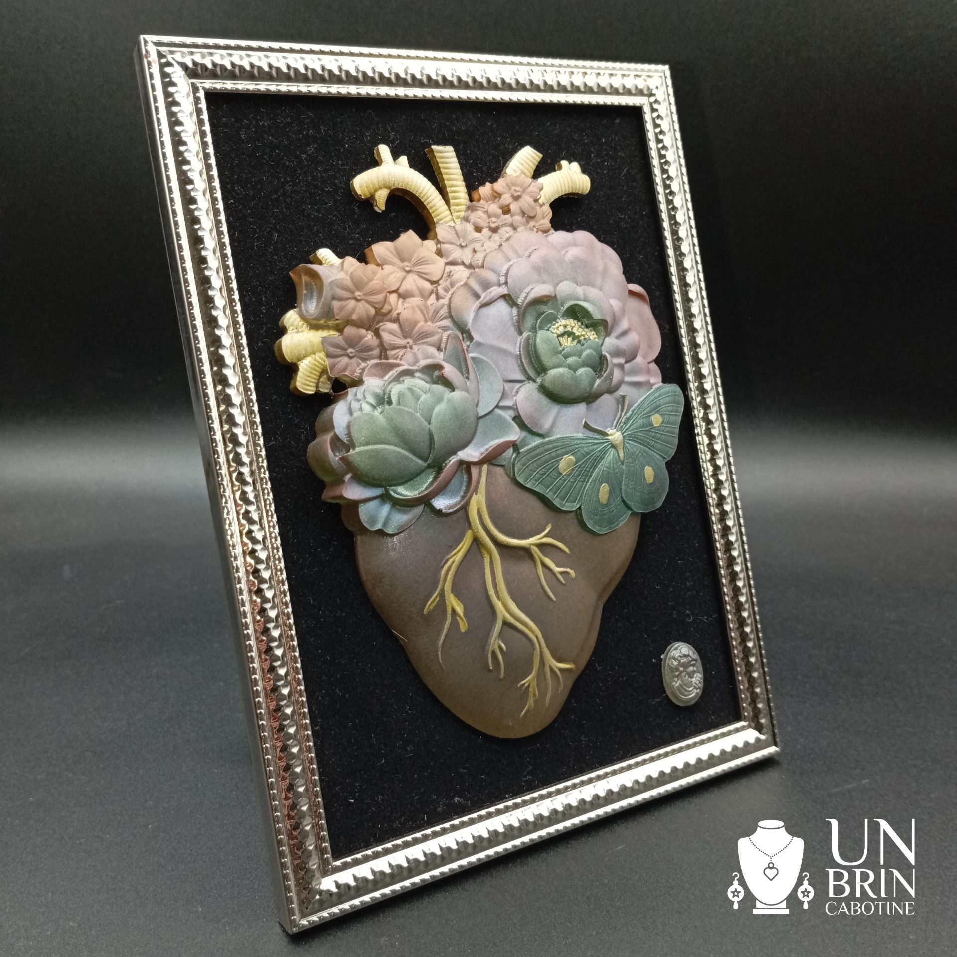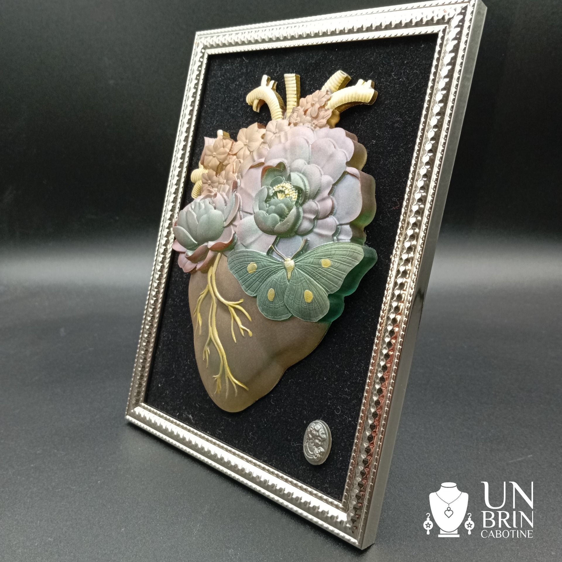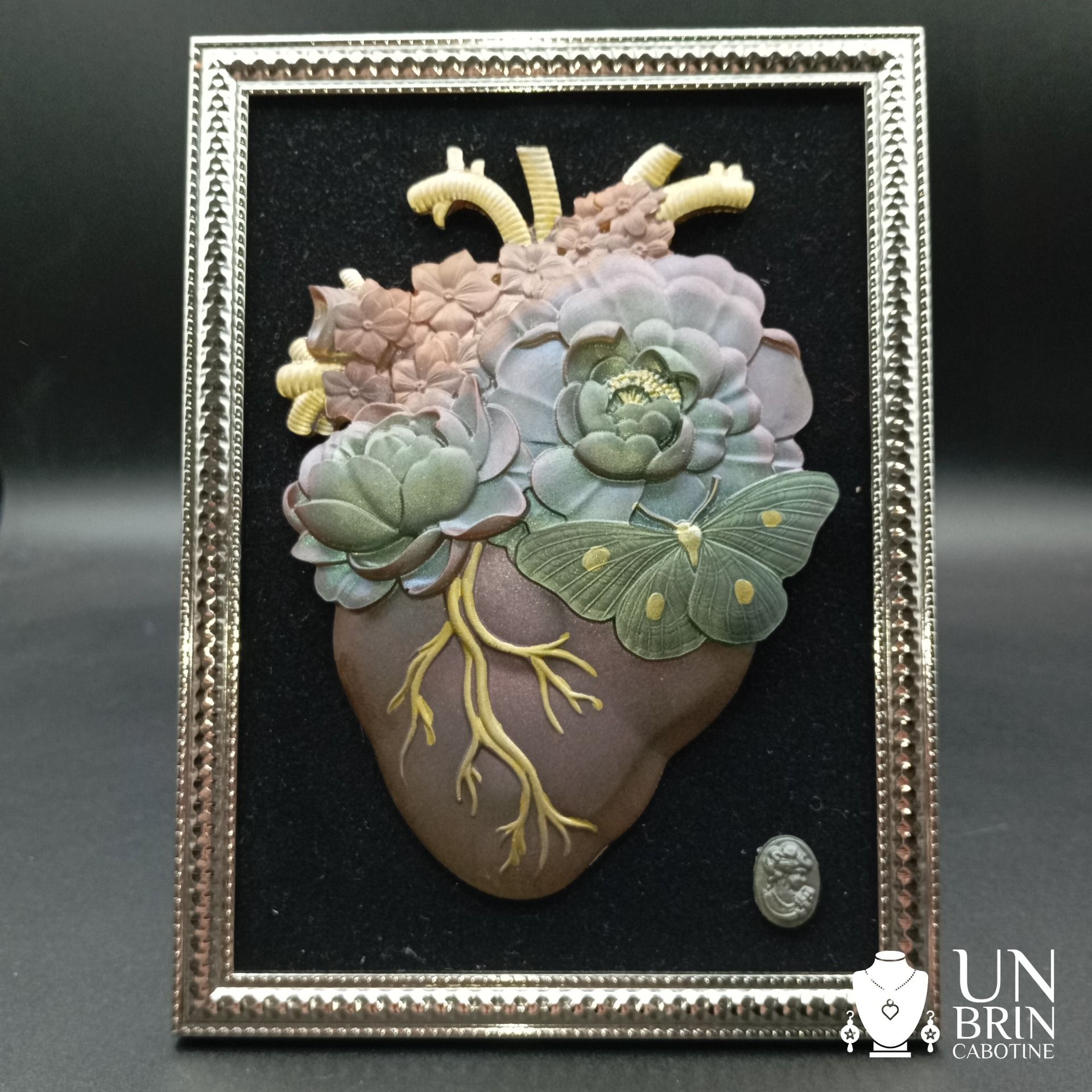 - Matériaux : Coeur, dans les tons or, violet, vert et son petit camée en bas à droite, en résine époxy. Fond du cadre velours noir.