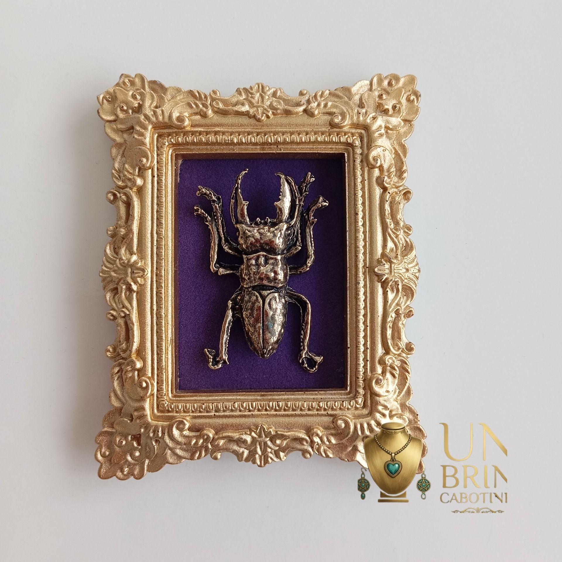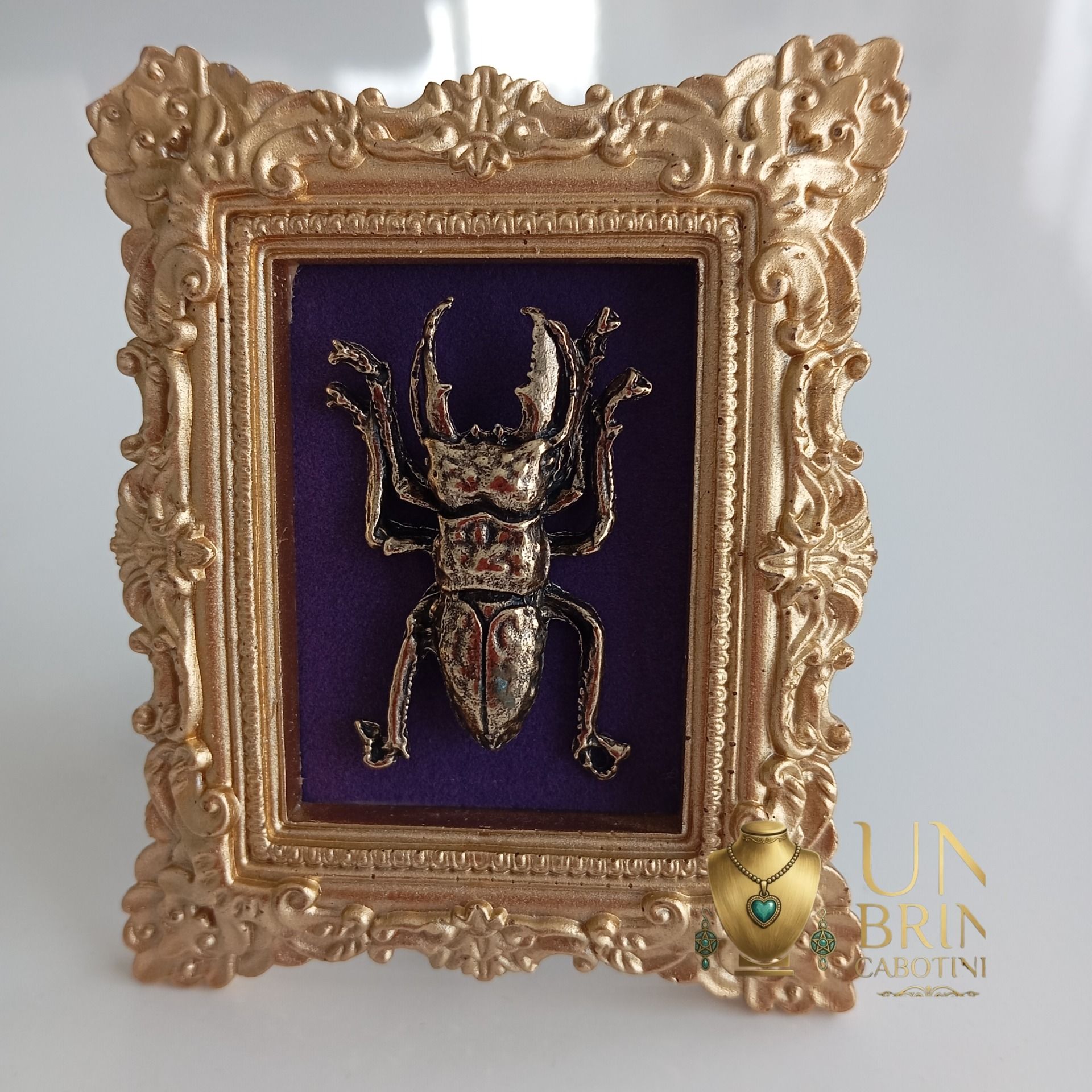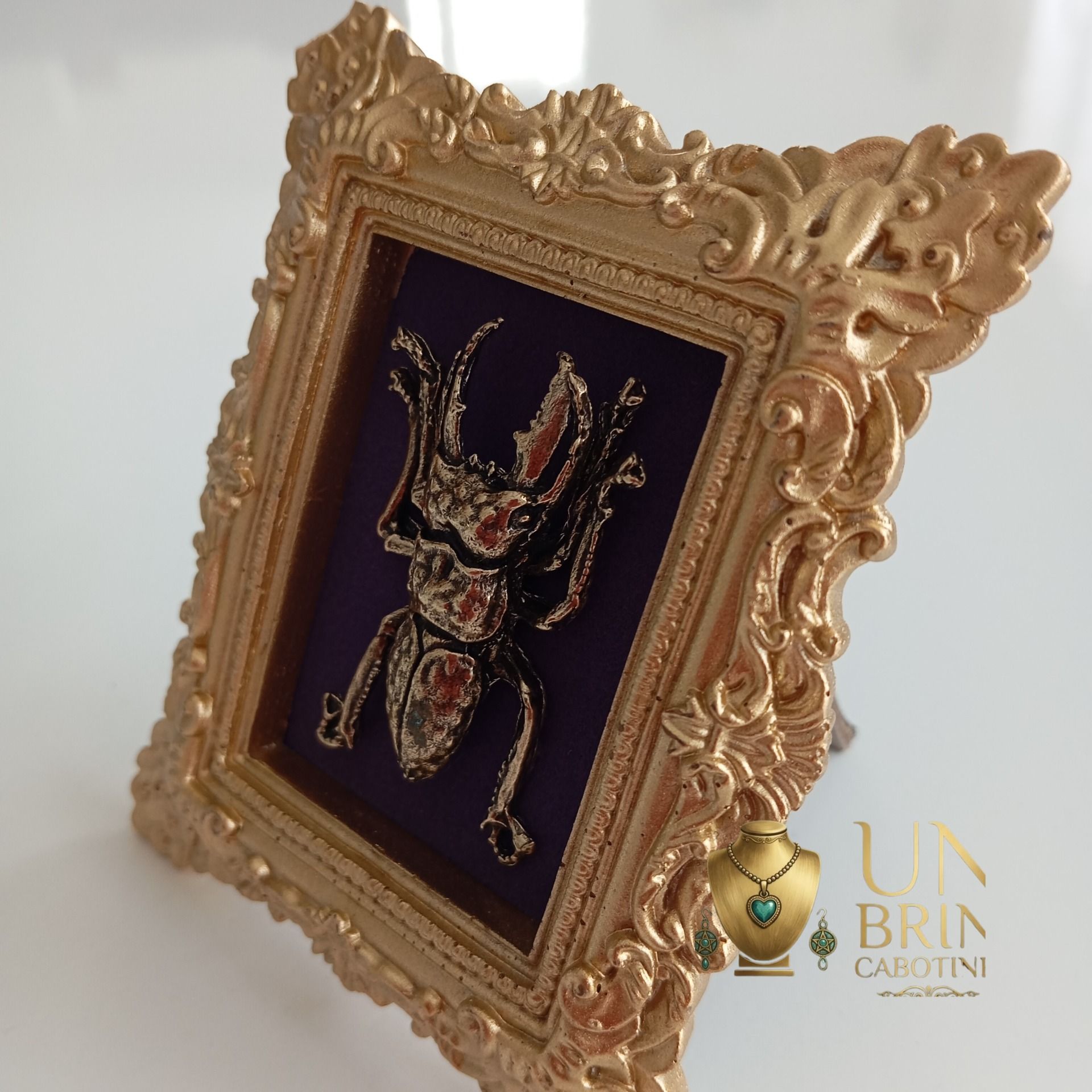 Plongez dans l'univers mystérieux du Scarabée du Sultan, une pièce maîtresse pour tout collectionneur de cabinet de curiosités moderne. Cette œuvre met en scène un scarabée cerf-volant (lucane) d'un doré vieilli saisissant, reposant majestueusement sur un fond de velours violet profond. Le cadre baroque, richement orné, vient sublimer cette figure avec une opulence digne d'un trésor ancien.