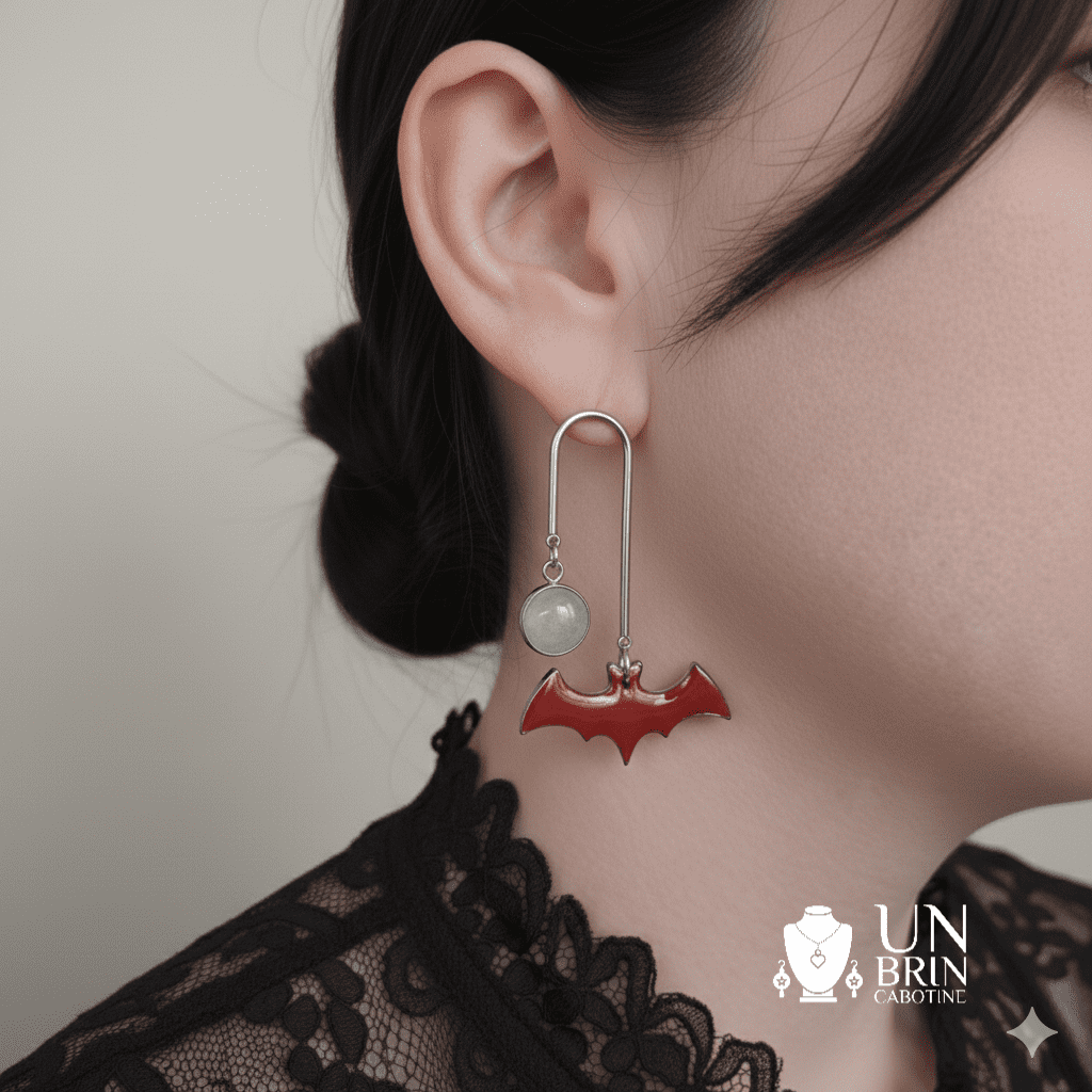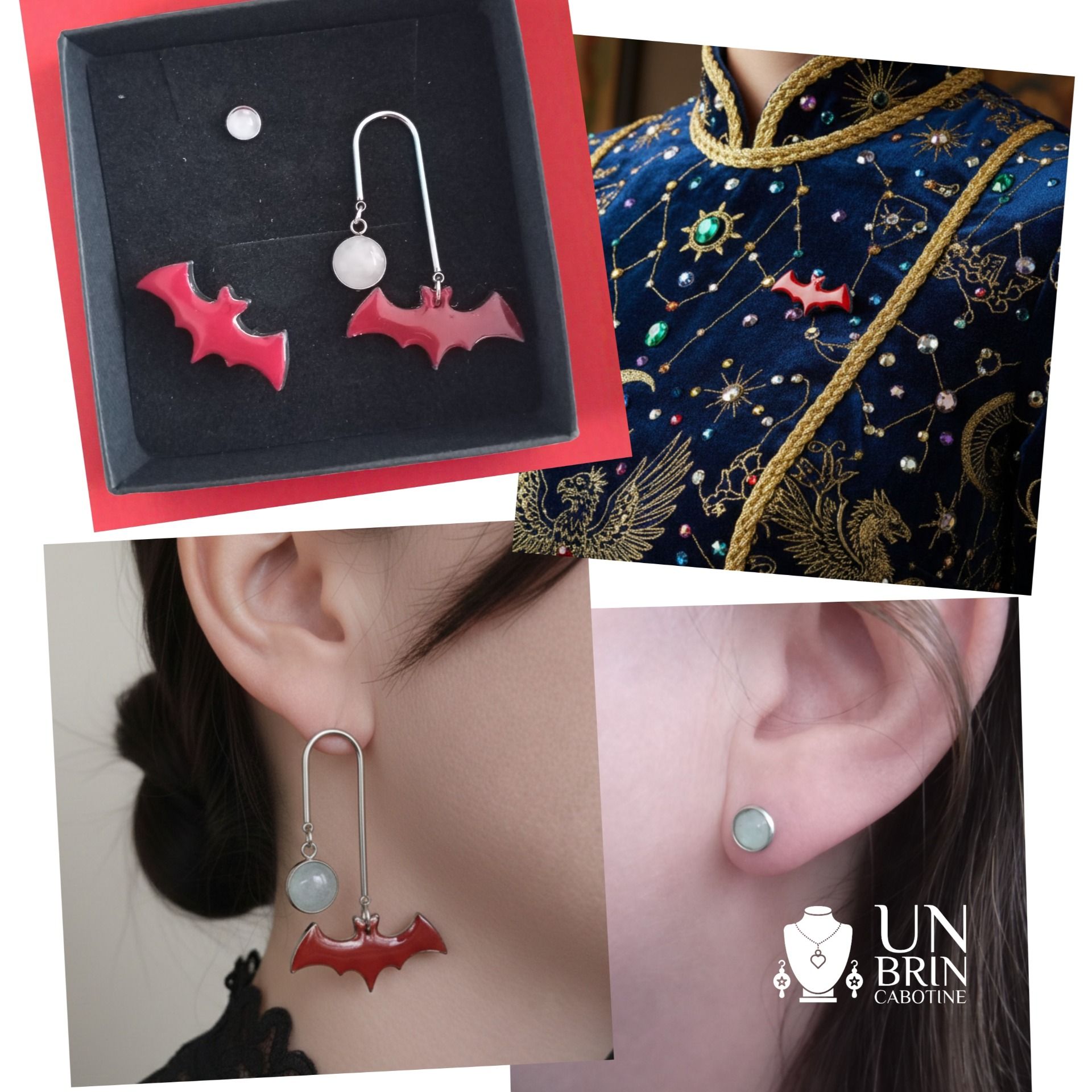 1 Paire de boucles d'oreilles asymétriques : Un duo captivant comprenant une puce d'oreille minimaliste à l'aspect cabochon blanc, style opaline et une boucle pendante argentée ornée d'un cabochon assorti et d'une chauve-souris rouge.
