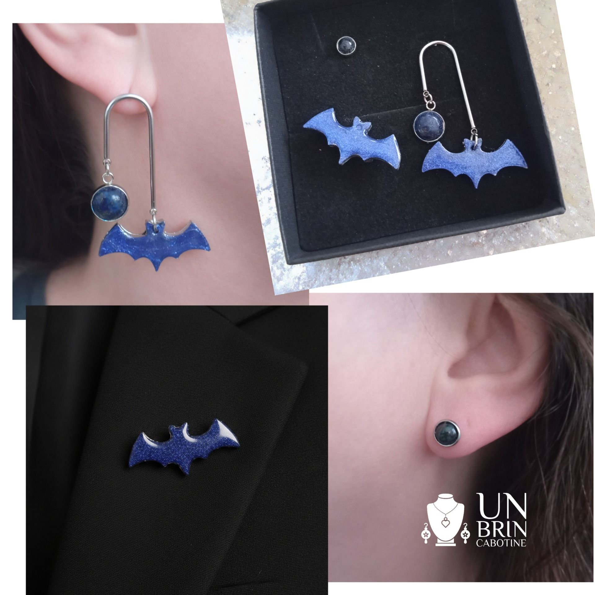 1 Paire de boucles d'oreilles asymétriques : Un ensemble moderne comprenant une puce d'oreille avec un cabochon en verre, dans les tons bleu et une boucle pendante en "U", sur monture argentée, ornée d'une chauve-souris bleue scintillante.