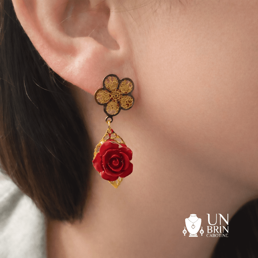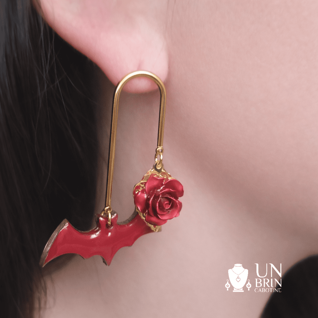 1 Paire de boucles d'oreilles asymétriques : Un duo raffiné composé d'une boucle "fleur de dentelle" avec rose pendante et d'une boucle graphique dorée ornée d'une rose et d'une chauve-souris rouge.