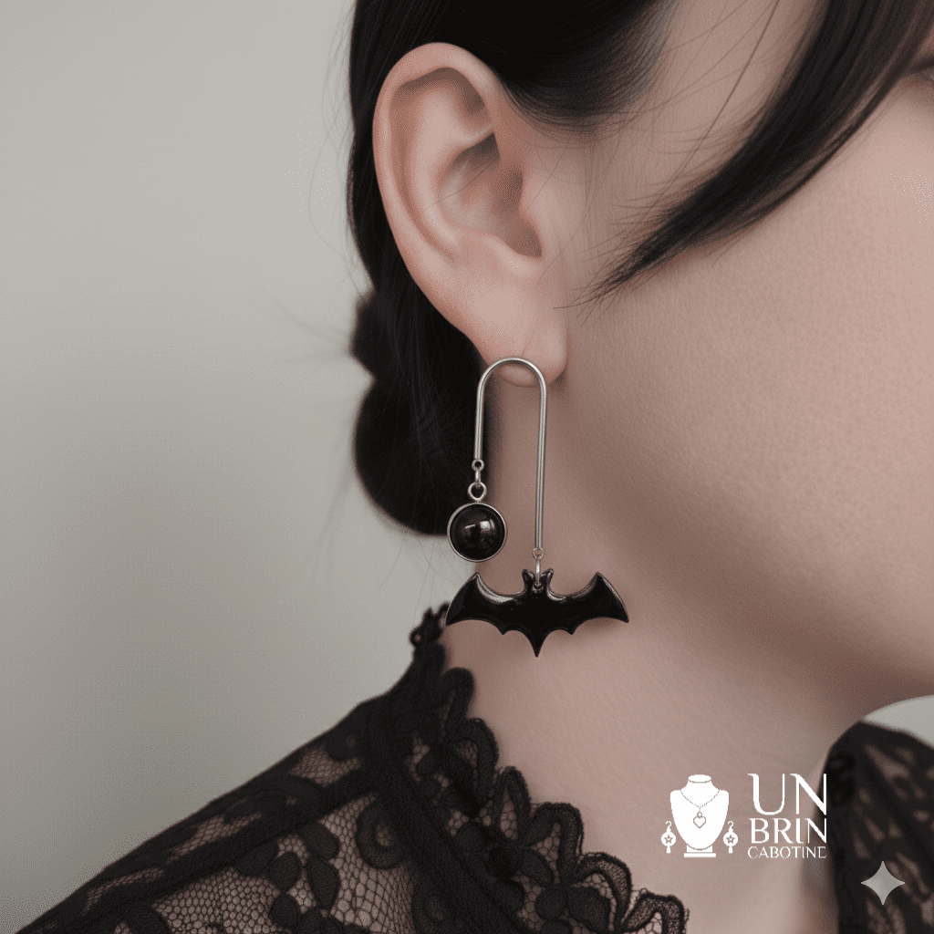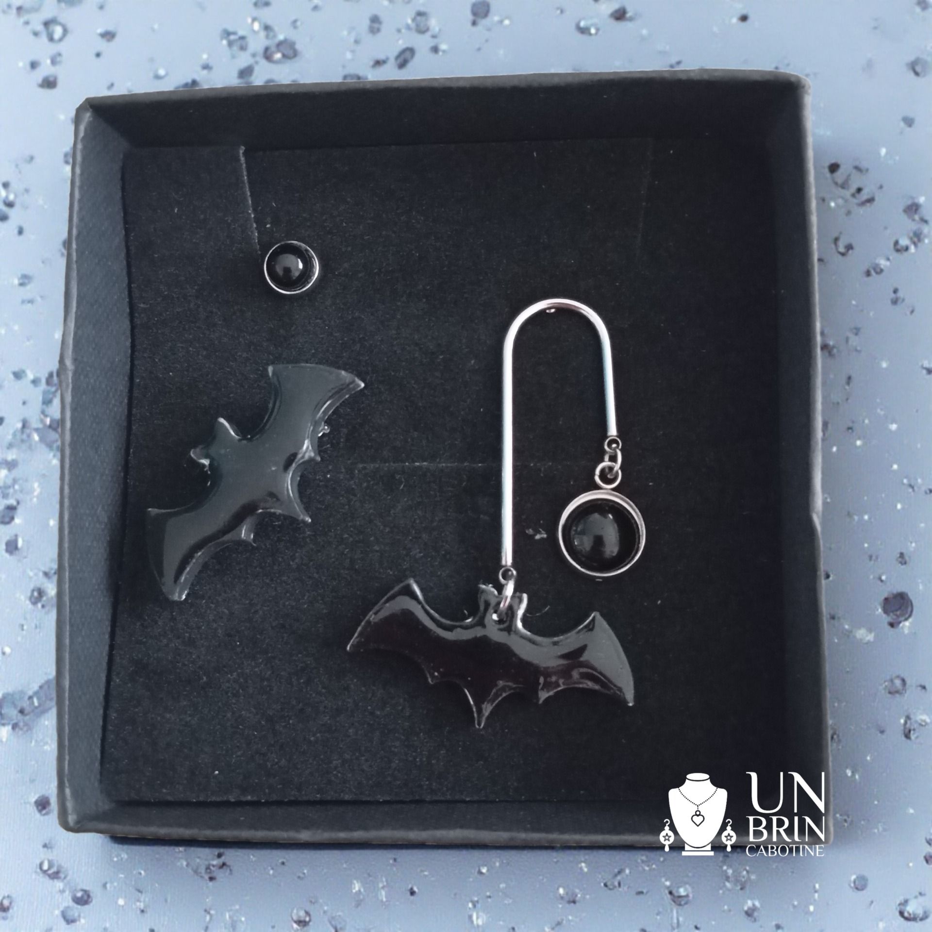 1 Paire de boucles d'oreilles asymétriques : Un duo original composé d'une puce discrète avec un cabochon de verre noir et une boucle pendante graphique composée d'une élégante monture argentée en "U", ornée d'un cabochon noir et d'une chauve-souris résinée en noire.
