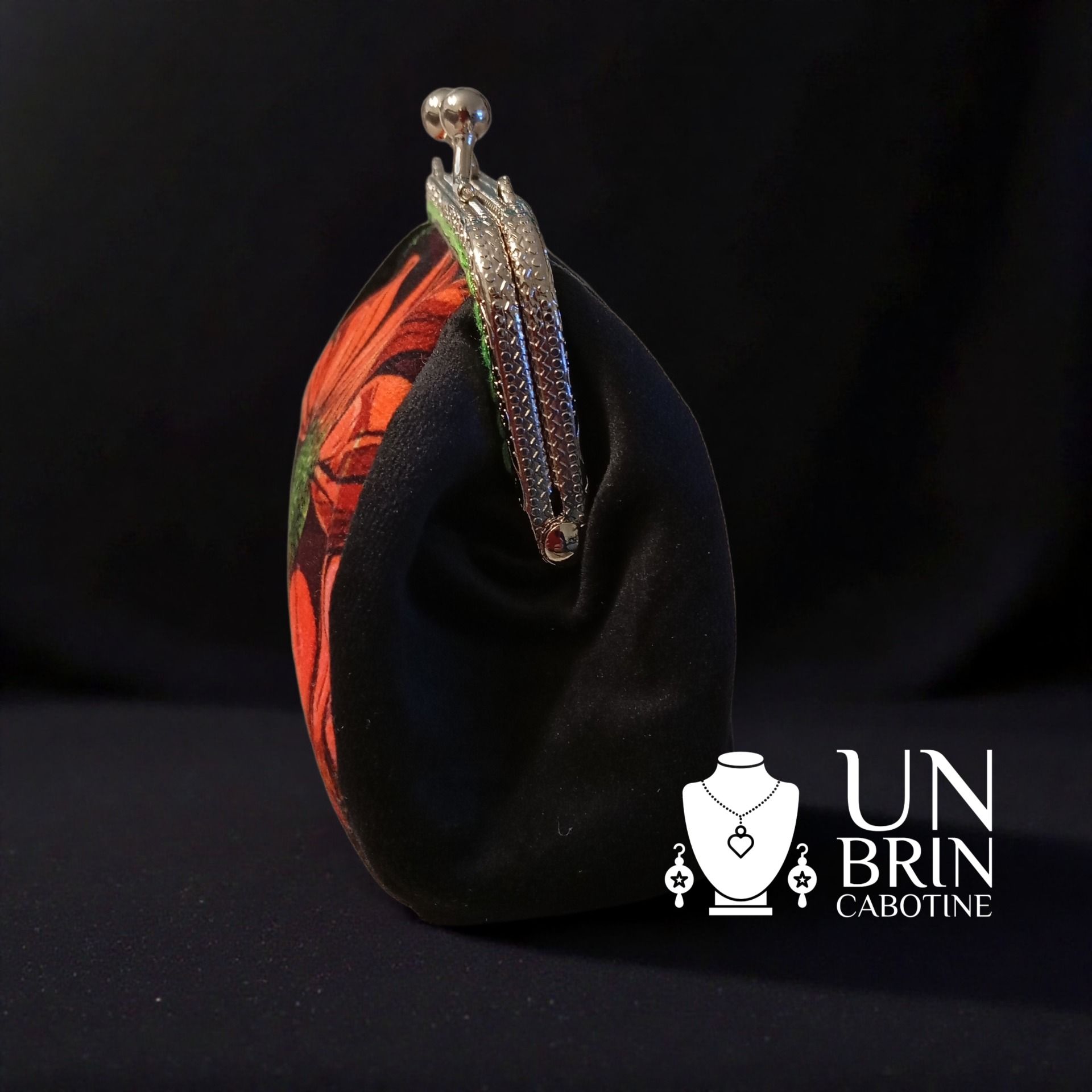 - Extérieur : Motifs "Marguerites" devant. Côtés et dos, velours noir.