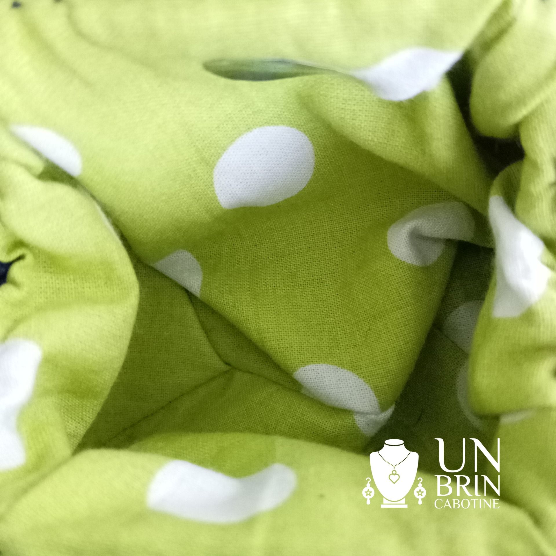 - Intérieur : Doublé motifs poids blancs et vert anis