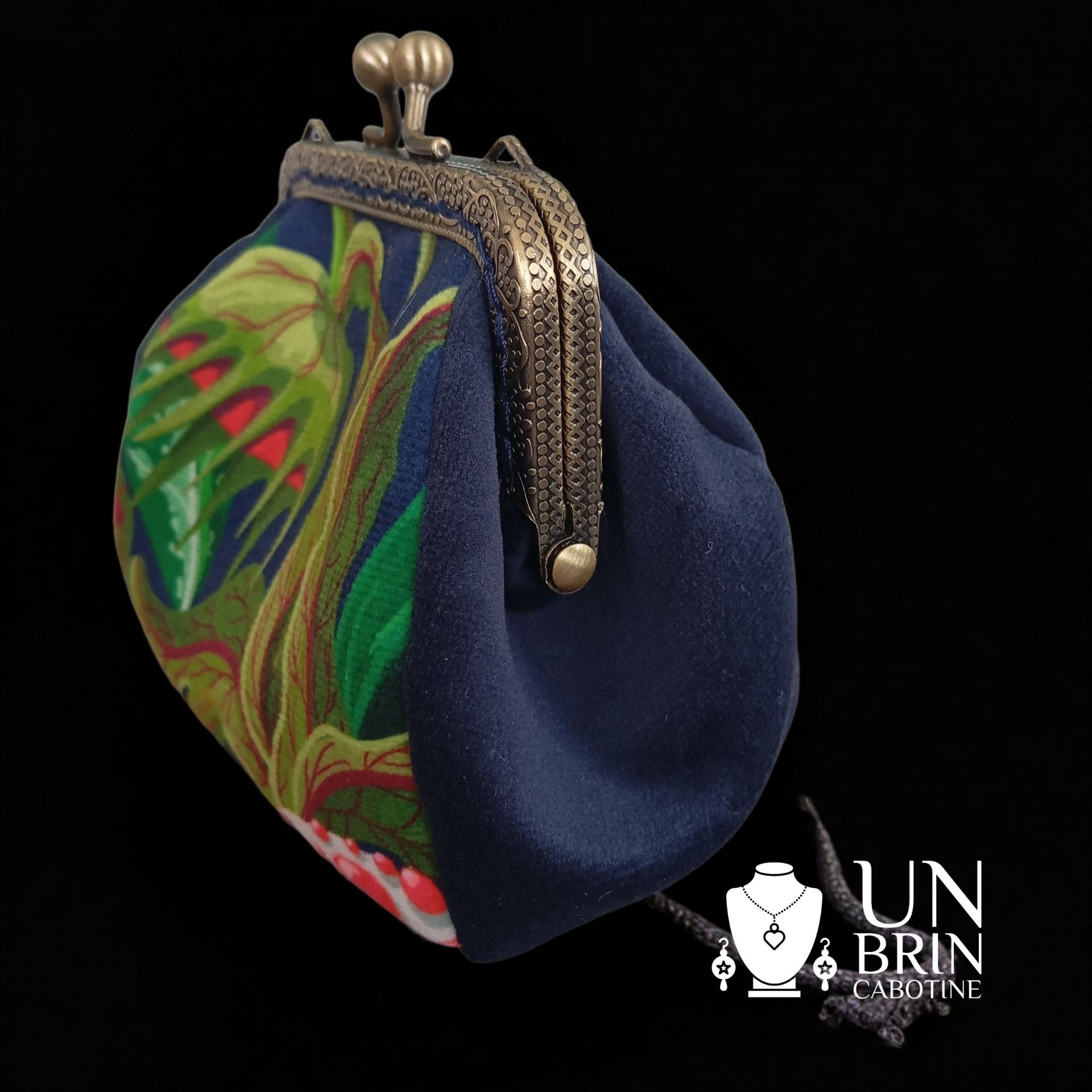 - Extérieur : Motifs "Plantes Carnivores" devant. Côtés et dos, velours marine