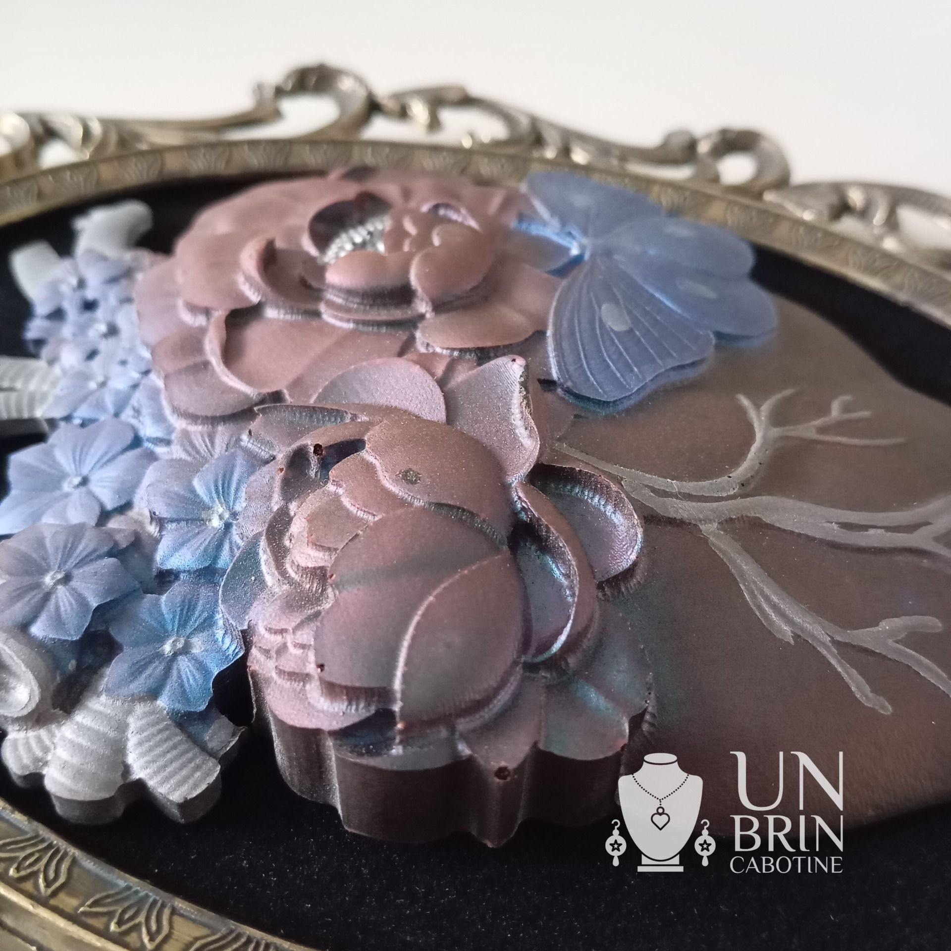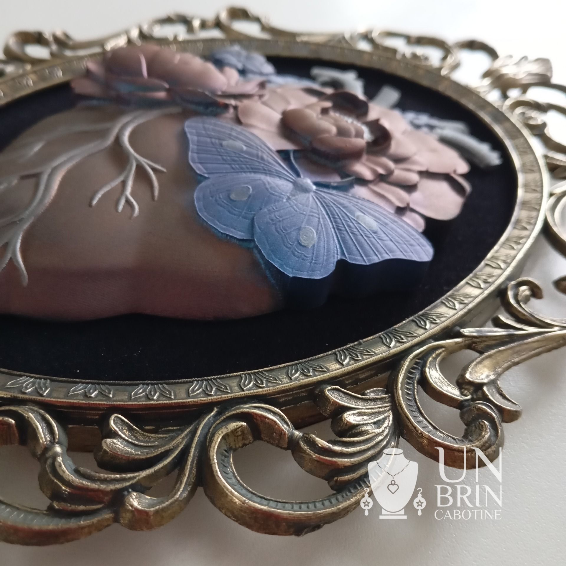 Présenté dans un cadre ancien, en laiton. A accrocher, 25x17 cm. Coeur posé sur du velours noir.