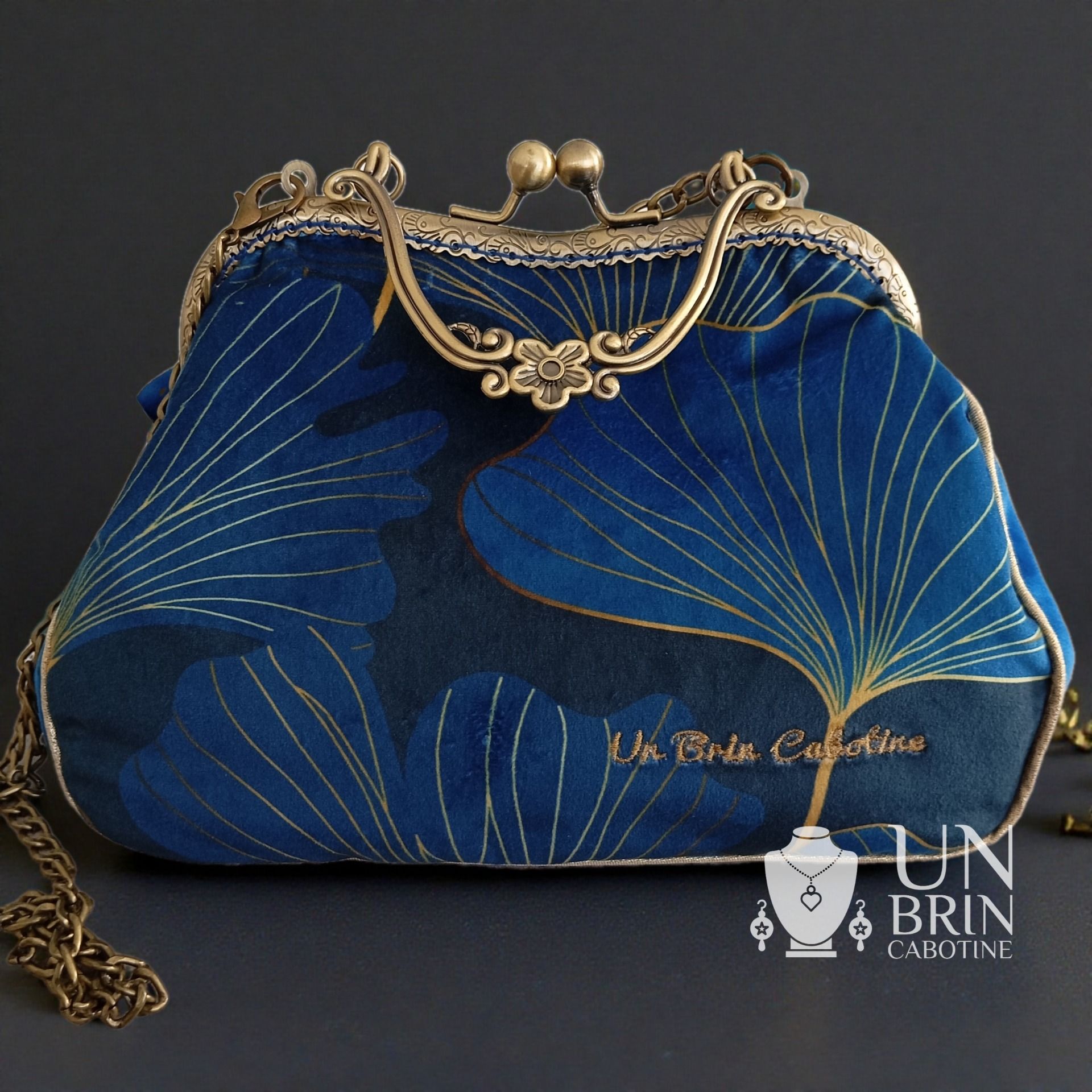 Une ode à la nature et au style Belle Époque. Ce sac à main en velours bleu profond est une pièce de caractère, alliant la douceur d'une matière noble à la brillance de motifs végétaux stylisés.