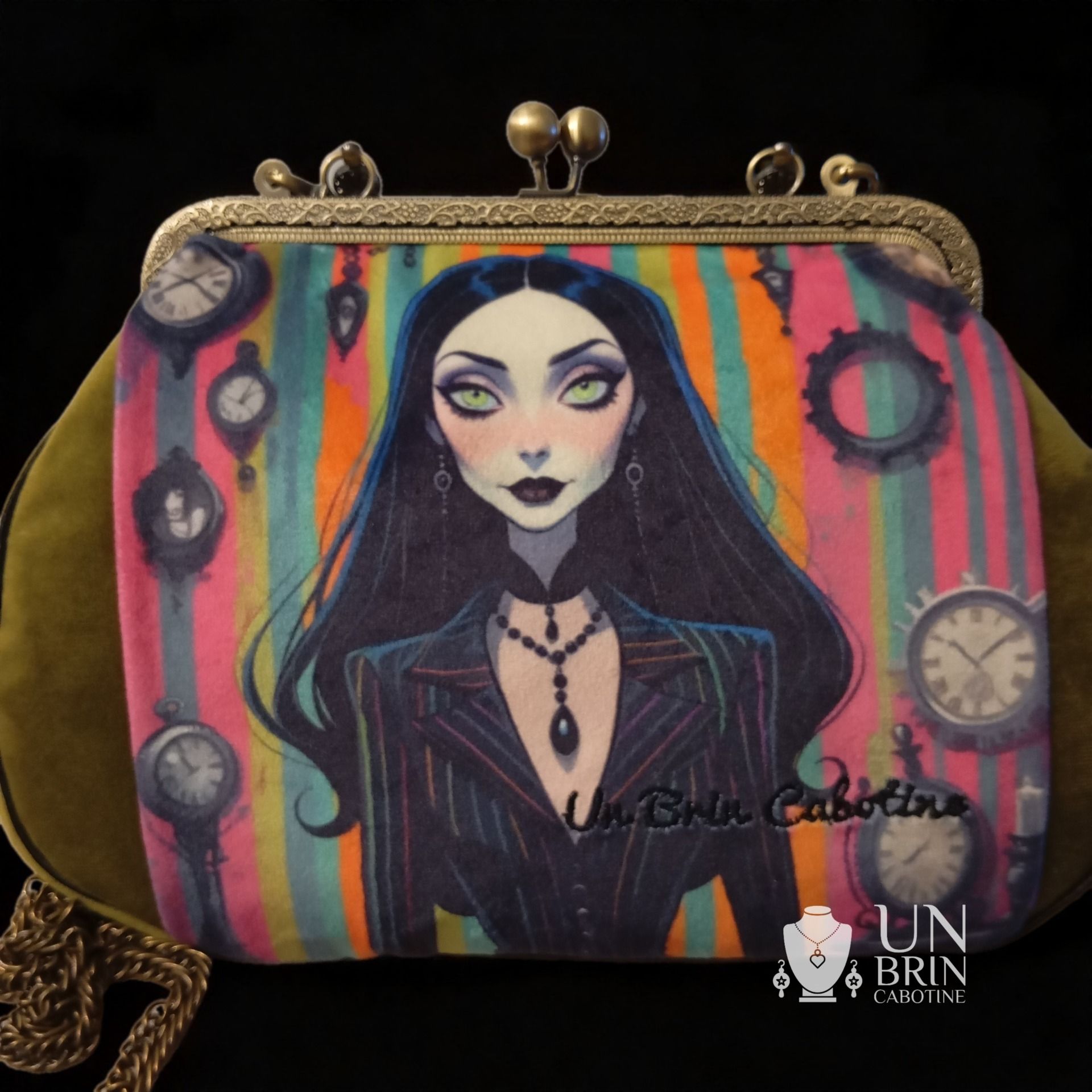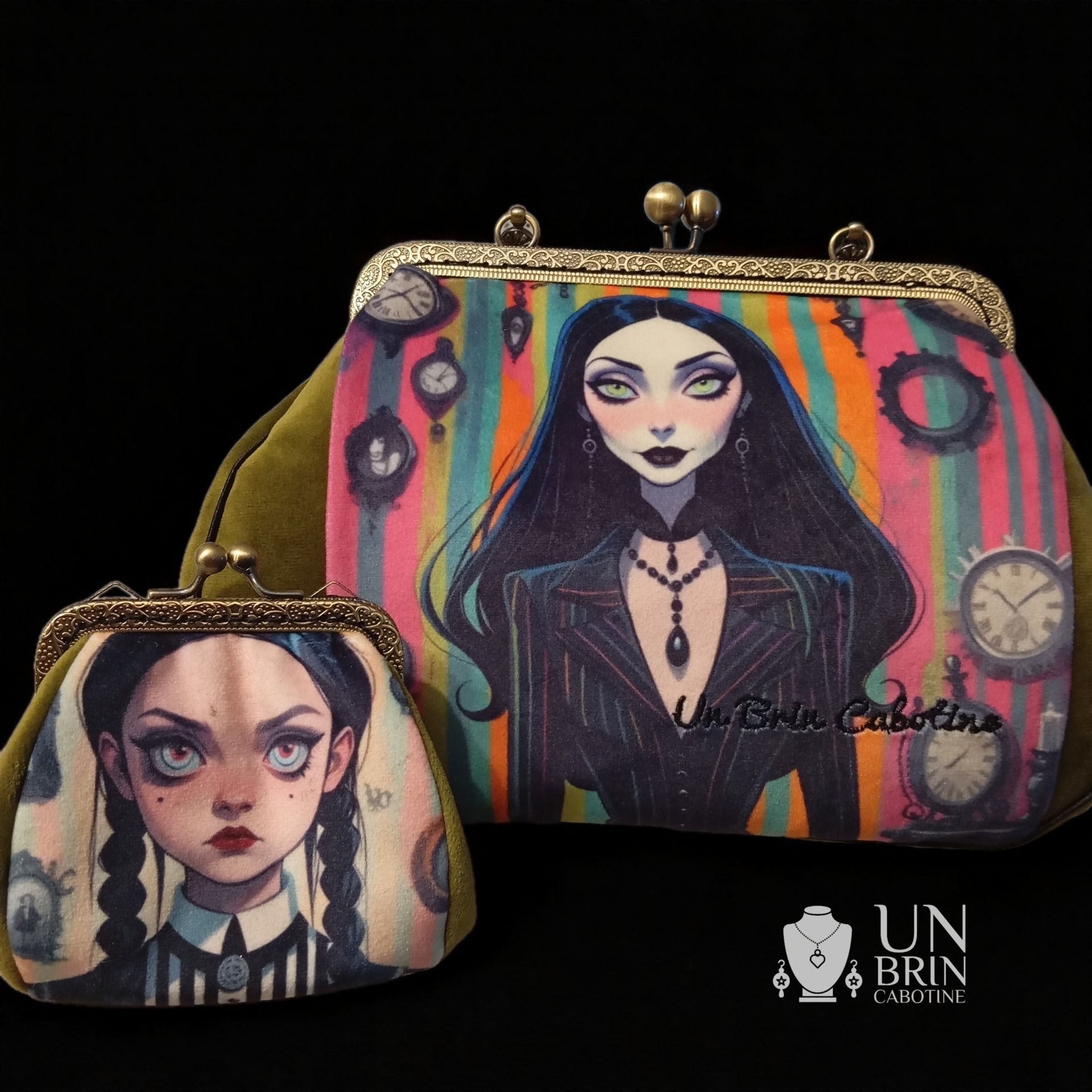 Entrez dans un monde où le mystère rencontre la couleur. Cet ensemble exclusif rend hommage aux icônes de la culture gothique à travers une interprétation artistique vibrante. Entre les rayures psychédéliques, les horloges figées dans le temps et l'élégance sombre de ces personnages légendaires, ce duo est l'accessoire ultime pour celles qui cultivent leur singularité avec un brin d'audace.