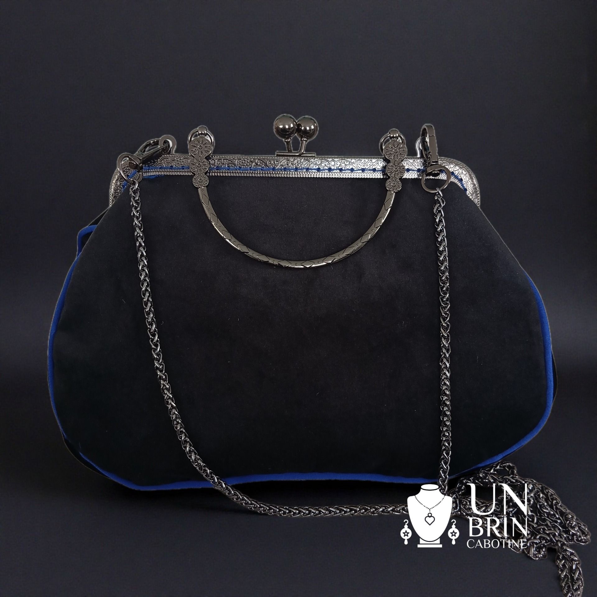 Laissez-vous séduire par le graphisme hypnotique de ce sac à main, pièce phare de la collection "L'Éclat Zébré". Ce modèle, entièrement confectionné dans un velours d'exception, marie l'élégance du noir et blanc à l'intensité d'un nœud papillon bleu électrique.