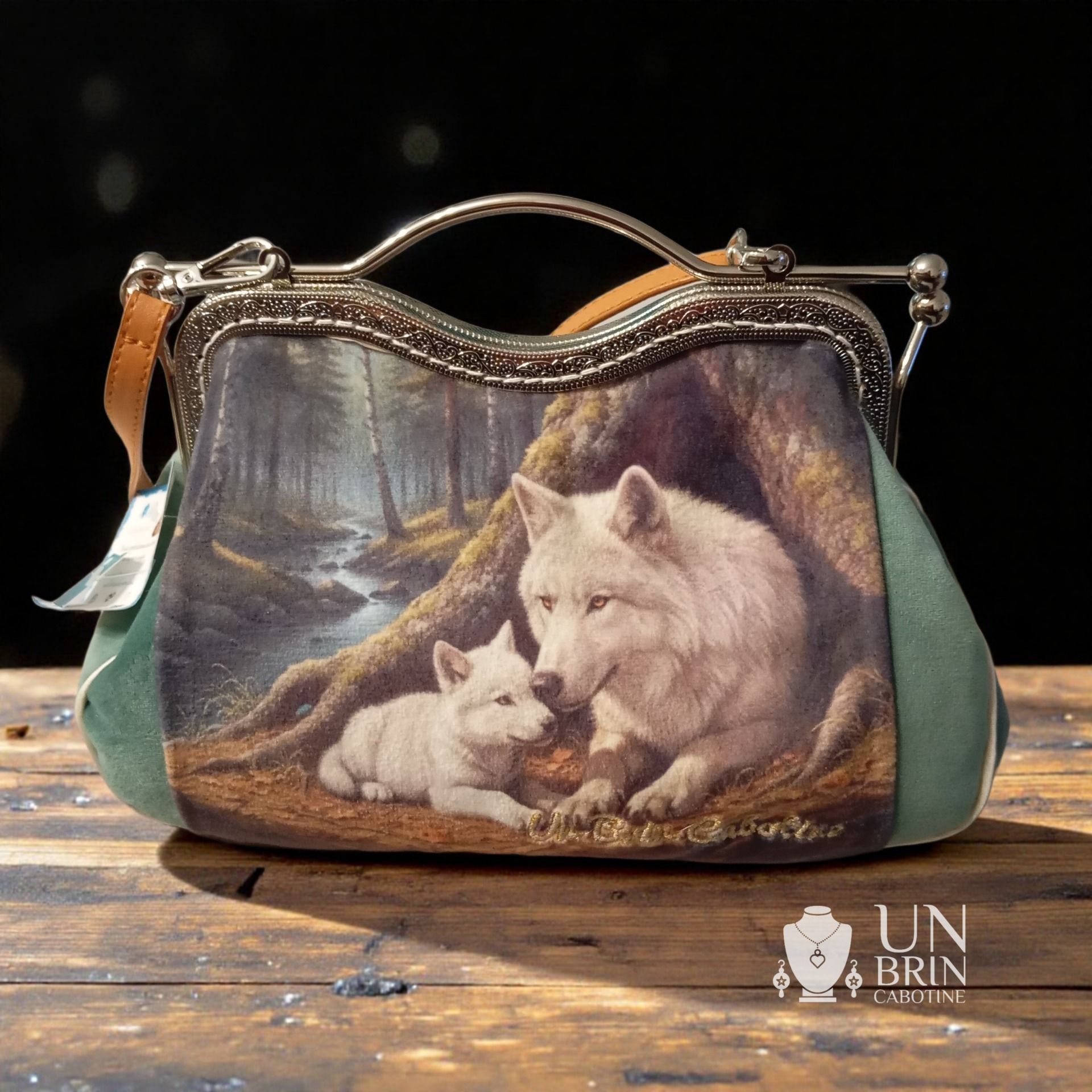 Un accessoire unique qui raconte une histoire. Ce sac à main artisanal allie le charme des objets d'autrefois à une illustration moderne et apaisante. Il met en scène une louve et son petit dans un décor de forêt naturelle. Un hommage vibrant à l'instinct maternel et à la beauté brute de la nature.